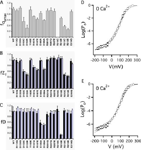 Figure 4. Effects of voltage sensor mutations on gating charge and allosteric coupling. (A) qaMAX for each voltage sensor mutant was determined from the mean PO-V relation in 0 Ca2+ (see MATERIALS AND METHODS) and normalized to that of the WT (1.89 e). qaMAX for R210C could not be determined for reasons discussed in the text. (B) The total gating charge (zT = zL + 4zJ) and (C) allosteric coupling factor D were estimated from fits of PO-V and qa-V relations to the allosteric models and normalized to those for the WT (zT = 2.62 e, D = 23.9). Shaded bars were determined by semi-automated fitting of the HCA model to 0 Ca2+ data (see MATERIALS AND METHODS). Solid bars represent fits to data in all [Ca2+] using the HA model (Table I) with parameters adjusted manually. (D and E) Confidence limits for manual fits were estimated for zT or D by adjusting zJ (panel D) or D (panel E) respectively from the best fit values (solid line) to exceed the error range of PO as indicated by dashed lines. |