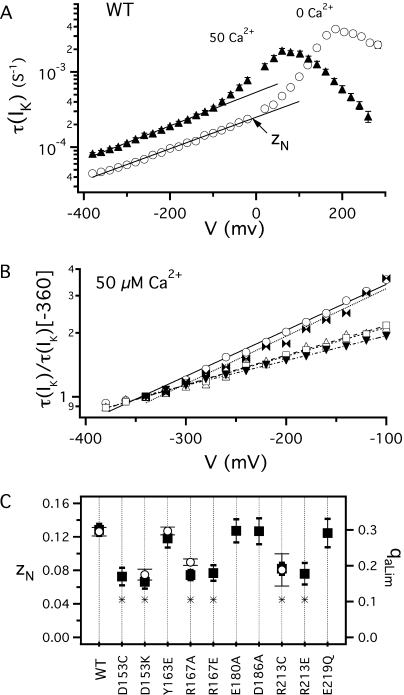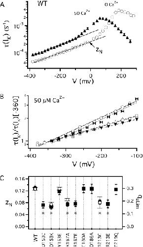 Figure 7. Voltage sensor mutations reduce the voltage dependence of channel closing. (A) Mean time constants of macroscopic IK (τ(IK)) for WT mSlo1 in 0 Ca2+(○) and 50 μM Ca2+(▴) are plotted on a log scale versus voltage. The limiting exponential voltage dependence is indicated by a solid line that has a slope representing the partial charge zN for channel closing (0 Ca2+, 0.122 ± 0.002 e; 50 Ca2+, 0.130 ± 0.002 e). (B) τ(IK)-V relations in 50 μM Ca2+, normalized at −360 mV, for WT (○), D153K (□), R167A (▾), R213C (▵), and E219Q (). Lines are exponential fits. (C) zN for WT and mutants in 50 μM Ca2+ (▪) is compared with the limiting slope of Po (qaLim) (○). Starred symbols indicate values of zN that are significantly different from the WT (P < 0.0001, Student's t test). |