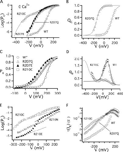 Figure 8. Effects of S4 mutation on the equilibrium for voltage sensor activation. (A) Mean log(PO)-V relations in 0 Ca2+ for WT(○), R207Q (▵), R207E (▴), and R210C (□). Mutant curves are shifted to more negative voltages, consistent with an increase in the equilibrium constant for voltage sensor activation (J0) in the HA model (lines, Table I parameters). (B) Normalized Q-V relations for WT and R207Q in 0 Ca2+ measured with admittance analysis from single experiments (see MATERIALS AND METHODS). Curves are fit with Boltzmann functions (WT: z = 0.59 e, Vh = 132 mV; R207Q: z = 0.65 e, Vh = −146 mV). (C) Po-V relations and fits from A are plotted on a linear scale to show that mutants have a similar PO and voltage dependence when voltage sensors are fully activated (i.e., V > 0). (D) qa-V relations for WT and R210C in 0 Ca2+ together with HA model fits showing that the voltage dependence of R210C is consistent with a gating charge similar to the WT. (E) Log(PO)-V relations for R210 mutants in 0 Ca2+ (R210C [□], R210N [], R210E []). R210E was best fit at positive voltages by a Boltzmann function with a partial charge of 0.47 e (solid line). Dashed lines are Boltzmann functions with charge of 0.3 e, representing the value of zL for the WT. (F) τ(IK)-V relations for WT, R207Q, and R210C. Mutant curves are fit (lines) with a bell-shaped function τ(IK) = [δ4 + γ4]−1 at potentials where voltage sensors are fully activated. δ4 and γ4 represent forward and backward rates for the C4–O4 transition in the HCA model (Fig. 3 D) and are exponentially dependent on voltage with partial charges z(δ4) and z(γ4), respectively. |
