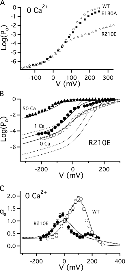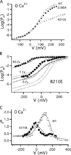 Figure 9. Effects of voltage sensor mutations on coupling. (A) Mean log(PO)-V relations for WT (○), E180A(▪), and R210E (▵) in 0 Ca2+ are superimposed as in Fig. 5 F to show that mutations reduce the magnitude of the voltage-dependent PO increase without altering the voltage sensitivity of PO at negative voltages. (B) Mean log(PO)-V relations for R210E in 0–50 μM Ca2+. Solid lines are the fits to the HA model (Table I parameters) with the coupling factor D reduced sevenfold relative to the WT (dashed lines). (C) qa-v relations for R210E (•) and WT (○) in 0 Ca2+ with HA model fits. The similar voltage dependence of the foot of these curves show that gating charge (zJ, zL) is unchanged. |