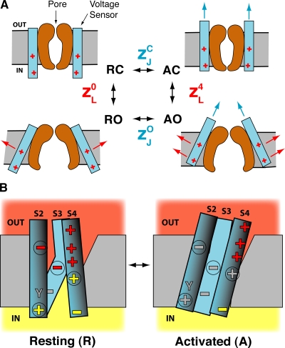 Figure 11. Mechanisms of voltage sensor activation. (A) Cartoon illustrates how voltage sensors may contribute to the gating charge associated with channel opening (zL). The pore and voltage sensor domains for two subunits in a channel are depicted in different combinations of O/C and R/A states respectively. When all voltage sensors are in the resting state, channel opening (RC to RO) displaces peripherally associated voltage sensors through the membrane electric field, thereby moving gating charge (red arrow, ). (B) Transporter-type mechanism of voltage sensor activation illustrates how positively and negatively charged voltages sensing residues in S2, S3, and S4 may both contribute to gating charge in mSlo1. All charged residues in S2–S4 are shown. Mutation of potential voltage-sensing residues (circled) reduce gating charge, implying that positive and negative charges must move in opposite directions through the electric field during activation. In the resting state, these positive and negative charges are shown as exposed to the internal (yellow) and external (red) solutions, through aqueous crevices, and therefore lie outside of the electric field. Upon activation, the packing of S2–S4 segments is altered such that charges are buried in the electric field, effectively moving positive charges outward and negative charge inward. Colors indicate the exposure of each residues (red, out; yellow, in; gray, buried). Non–voltage-sensing residues and positions (Y163) are shown as remaining in a constant environment. |