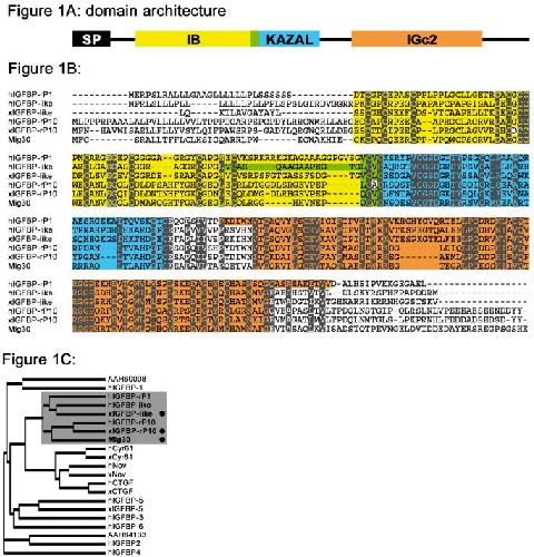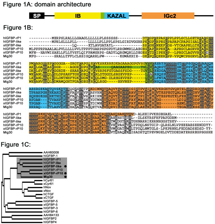 Figure 1. A: Schematic diagram of the protein domain architecture. Black, signal peptide (SP); yellow, insulin growth factor-binding homologues (IB, SMART accession no. 00121); blue, kazal-type serine protease inhibitors (KAZAL, SMART accession no. 00280); green, overlap of IB and KAZAL; orange, immunoglobulin C-2 type (IGc2, SMART accession no. 00408). B: Sequence alignment of hIGFBP-rP1 (GenBank accession no. NP_001544), xIGFBP-like (GenBank accession no. DQ515890), and xIGFBP-rP10 (GenBank accession no. AAH72910, Xenopus laevis MGC80370 protein) together with their human homologues (hIGFBP-like, GenBank accession no. NP_001007564; hIGFBP-rP10, GenBank accession no. NP_112191) and Mig30 (GenBank accession no. BAB84702). Note: The xIGFBP-like is not a full-length sequence. Conserved amino acids are shaded in gray. Dashes indicate gaps introduced to maximize the alignments. Protein domains are highlighted with same colors as in A. Note: The white box in the overlap of IB and KAZAL of hIGFBP-rP10 and white box in IB of xIGFBP-rP10 mark single amino acid substitutions (see the Results section). C: Cladogram of human and Xenopus laevis IGFBPs and IGFBP-rPs (see Table 1). The proteins characterized in this study (marked with a dot) together with their human homologues and hIGFBP-rP1 form a group (shaded in gray). For the putative Xenopus homologues of hIGFBP-1 and -2, GenBank accession numbers are AAH60008 and AAH84133, respectively. The tree was generated using ClustalW. |