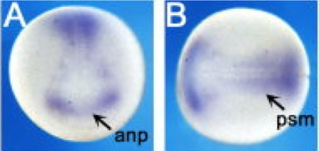 mig30 (mig30) gene expression in Xenopus laevis embryo, assayed via in situ hybridization, NF stage 10.5, saggital section, anterior up. |