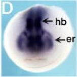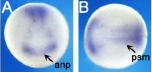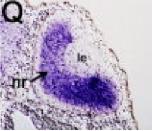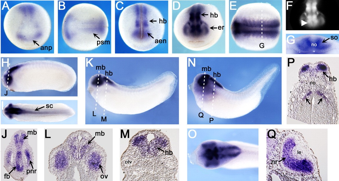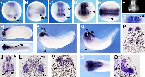 Figure 5. Whole-mount in situ hybridization of xIGFBP-like. Positions of sections are indicated by white dotted lines, and letters mark corresponding panels. A,B: Stage (st.) 15. A: Anterior view. B: Dorsal view, anterior to the left. C: St. 18; anterior view. D-G: St. 21. D: Anterior view. E: Dorsal view, anterior to the left. F: Reversed saturation image of D, to visualize pattern of strongly stained areas. G: Transverse section. H-J: St. 25. H: Lateral view. I: Dorsal view, anterior to the left. J: Transverse section. K-M: St. 32. K: Lateral view. L,M: Transverse sections. N-Q: St. 39. N: Lateral view. O: Magnification of head region, dorsal view, anterior to the left. P: Transverse section. Q: Transverse section. aen, archencephalic region; anp, anterior neural plate; er, prospective eye region; fb, forebrain; hb, hindbrain; le, lens; mb, midbrain; nr, neural retina; no, notochord; otv, otic vesicle; ov, optic vesicle; pnr, prospective neural retina; psm, presomitic mesoderm; sc, spinal cord; so, somite. |
