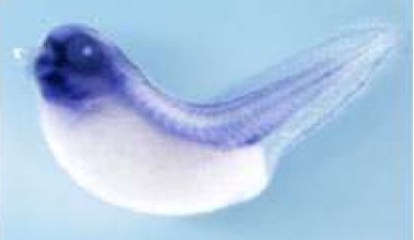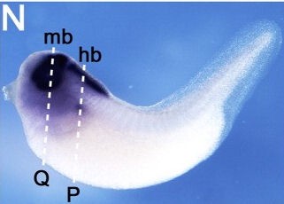 mig30 (mig30) gene expression in Xenopus laevis embryo, assayed via in situ hybridization, NF stage 8.5, saggital section, anterior up.