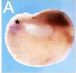 Figure 3. In situ hybridization of Mig30. Positions of sections are indicated by dotted lines, and letters mark corresponding panels. A-C: Sagittal sections; dorsal to the left. A: Stage (st.) 8.5; asterisk marks the blastocoele chordin- and noggin-expressing center. B,C: Black arrowheads mark the dorsal lip. B: St. 10.25. C: St. 11.5. D: St. 14; anterior view. E-G: St. 17. E: Anterior view. F: Dorsal view, anterior to the left. G,H: Transverse sections. I,J: St. 20. I: Anterior view. J: Dorsal view, anterior to the left. K,L: St. 31. K: Lateral view. L: Transverse section. M,M prime : St. 39. M: Lateral view. M prime : Transverse section. bt, branchial tissue; e, eye; he, heart; le, lens; lp, prospective lens placode; no, notochord; nt, neural tube; otp, prospective otic placode; otv, otic vesicle; re, retina; so, somite. |