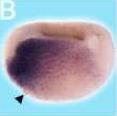 igfbpl1 ( insulin-like growth factor binding protein-like 1) gene expression in a Xenopus laevis embryo, as assayed by in situ ybridization, NF stage 15 lateral view, anterior left, dorsal up. |