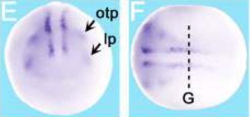 mig30 ( mig30) gene expression in Xenopus laevis embryo, assayed via in situ hybridization, NF stage 17, anterior view, dorsal up (E) and dorsal view, anterior right (G). |