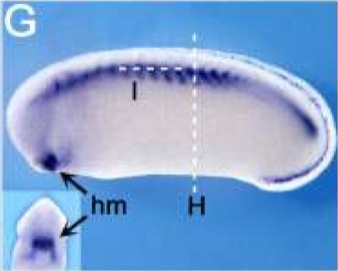 igfbpl1 ( insulin-like growth factor binding protein-like 1) gene expression in a Xenopus laevis embryo, as assayed by in situ ybridization, NF stage 21, lateral view, anterior left, dorsal up (H), and dorsal view (I). |