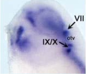 Figure 4. In situ hybridization of xIGFBP-rP10. Positions of sections are indicated by white dotted lines and letters mark corresponding panels. A,B: Sagittal sections. A: Stage (st.) 4. B: St. 10.5; black arrowheads mark dorsal lip; insert: vegetal view. C,D: St. 15. C: Anterior view. D: Dorsal view, anterior to the left; insert: transverse section. E,F: St. 21. E: Anterior view. F: Dorsal view, anterior to the left. G-I: St. 24. G: Lateral view; insert: vegetal view of head. H: Transverse section. I: Crude horizontal section at the level of the notochord. J-M: St. 30. J: Lateral view; insert: vegetal view of head. K-M: Transverse sections. N,O: St. 35; lateral view. O: Magnification of head region. P,Q: St. 40; lateral view. O: Magnification of head region; reversed saturation image of P, to visualize pattern of strongly stained areas. cg, cement gland; cnh, chordoneural hinge; df, dorsal fin; fp, floor plate; hm, head mesenchyme; no, notochord; otv, otic vesicle; so, somite; vf, ventral fin; VII and IX/X, cranial ganglia. |