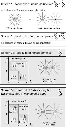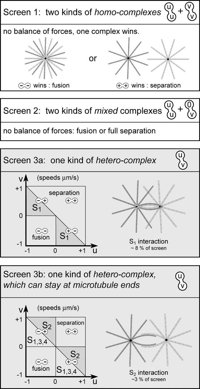 Figure 1. Summary of the screens. Screen 1 was performed with two kinds of homocomplexes, with all sorts of configurations of minus or plus end–directed motors. It produced fusion of the asters or their full separation. Screen 2 is inspired by the putative configuration of the biological motors involved in the spindle. Screen 3a was performed with one kind of heterocomplex. It produced fusion, full separation, oscillations, and one type of nonfused stable interaction, solution S1. To achieve S1, the speeds of the motors u and v need to satisfy u + v < 0 and u × v < 0, as depicted in the diagram. Screen 3b is a variation in which the motors could hold on to the microtubule ends. Four solutions are found, as discussed in the text.