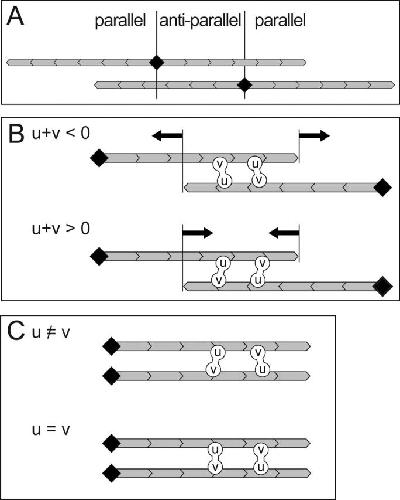 Figure 4. Symmetry arguments. (A) Two asters can have antiparallel overlaps, but also parallel ones, when they are close. (B) On an antiparallel overlap, heterocomplexes of speeds u and v produce attractive force if u + v < 0, or repulsive force if u + v > 0. Both possible motor configurations produce forces in the same direction. (C) On a parallel overlap, if u ≠ v, the two configurations result in opposite forces. If they are equally probable, these forces cancel each other. A homocomplex (u = v) does not produce any force on parallel microtubules and stabilizes the overlap.