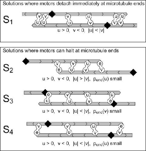 Figure 3. The balance of forces in the solutions. Schematic asters in 1D only have two opposing microtubules radiating from a common center represented by a black diamond. All solutions are built from one kind of heterocomplex with two speeds u and v, which must satisfy the conditions specified here. Solution S1 is found even when motors immediately detach from the end of the microtubules, whereas the others are obtained when the motors can stay at the end (in this situation, u or v is replaced by e). Pushing or pulling is schematically represented here by the tilt of the complex, which is a consequence of the relative movement of both motors. The attractive or repulsive nature of the forces can be deducted by mentally trying to restore the complexes in a vertical position.