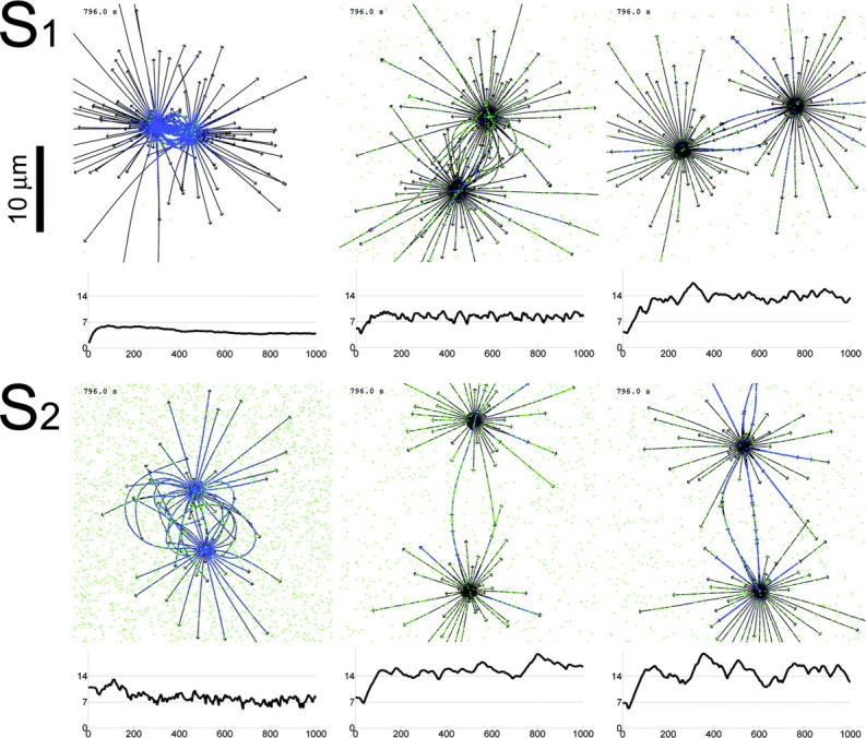 Figure 2. Examples of stable interactions between dynamic asters with heterocomplexes. (Top) Solutions of type S1. The speeds (μm/s) of the two motors forming the complex are as follows: left, 0.35 and -0.91; middle, 0.31 and −0.73; and right, 0.6 and −0.83. (Bottom) Example of solution S2 speeds are as follows: left, 0.95 and −0.45; middle, 0.47 and −0.45; and right, 0.89 and −0.64. Below each example is plotted the distance between the two asters (μm) as a function of time (s). It is not possible to distinguish from these views the different solutions. See animations at (http://www.embl-heidelberg.de/ExternalInfo/nedelec/asters).