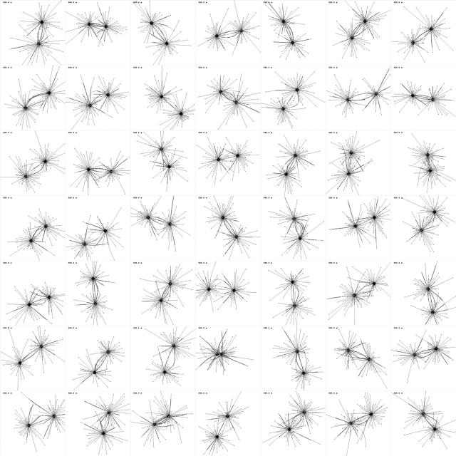 Figure 5. Reliability of a solution S1. Figures produced by 49 simulations, all performed with the same parameter set, but with different initial configurations and random number sequences. The figures are all similar, showing the reliability in which the parameter set determines the evolution of the system toward a unique interaction configuration. Each picture covers 30 × 30 μm.