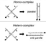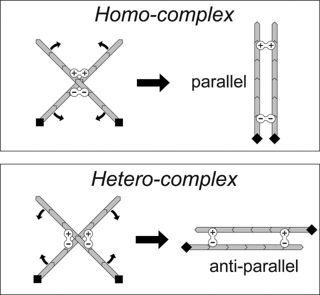 Figure 7. The zipper effect. Schematically, the action of homocomplexes on two microtubules produces parallel microtubule overlap, whereas heterocomplexes produce antiparallel overlaps.
