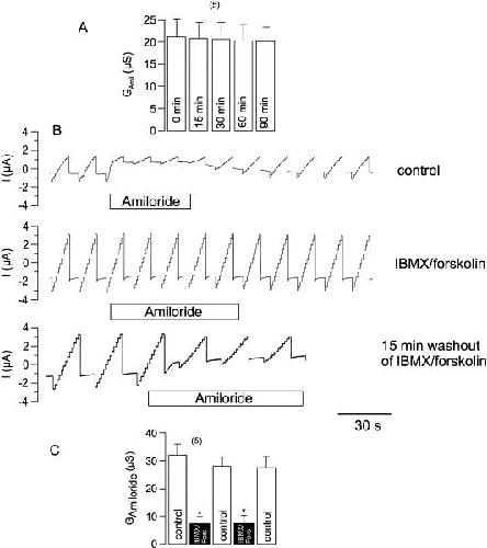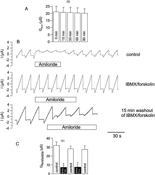 Fig. 1. Expression of ENaC and CFTR in Xenopus oocytes. (A) Continuous recording of amiloride-sensitive whole cell conductance (GAmiloride) over 90 min does not show any run down of GAmiloride. (B) Original recordings of the whole cell currents obtained in a CFTR/ENaC expressing oocyte. Activation of CFTR by stimulation with IBMX (1 mmol/l) and forskolin (2 μmol/l) inhibits the amiloride-sensitive whole cell current. The inhibition shows a partial recovery of GAmiloride 15 min after omission of IBMX/forskolin. (C) GAmiloride can be inhibited repetitively by activating and deactivating CFTR. * indicate significant difference from control (paired t-test). (Number of experiments).
