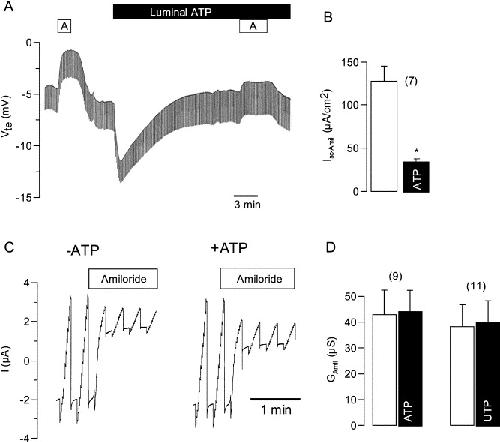 Fig. 2. Effects of stimulation of luminal purinergic receptors by ATP or UTP on ion transport in mouse trachea and Xenopus oocytes expressing ENaC. (A) Continuous recording of the transepithelial voltage (Vte) in mouse trachea. ATP (100 μmol/l) induced a transient voltage deflection and inhibited amiloride (A) sensitive transport. (B) Summary of the amiloride-sensitive short circuit currents before and after stimulation with ATP. (C) Whole cell currents measured in Xenopus oocytes expressing the epithelial Na+ channel ENaC and effects of amiloride (10 μmol/l) in the absence or presence of ATP (100 μmol/l). (D) Summary of the amiloride-sensitive whole cell conductances (GAmil) measured in ENaC expressing oocytes. Stimulation by ATP or UTP (both 100 μM) has no impact on GAmil. (Number of experiments).