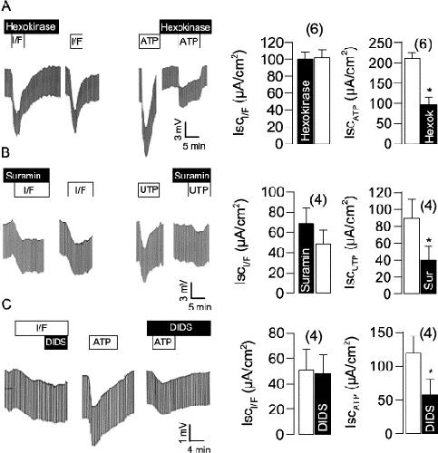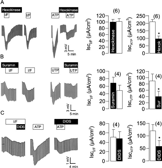 Fig. 3. Effects of stimulation by IBMX (100 μmol/l)/forskolin (2 μmol/l) (I/F) and ATP or UTP (both 100 μmol/l) on transepithelial voltages and summary of short circuit currents measured in mouse trachea. (A) Incubation with hexokinase (5 U/ml) and glucose (15 mM) attenuates ATP-activated transport but has no effect on I/F induced secretion. (B) The P2Y blocker suramin (100 μmol/l) inhibits UTP-activated transport but has no effect on I/F-induced secretion. (C) The Cl− channel blocker DIDS inhibits ATP-activated transport but has no effect on I/F-induced secretion. * indicate significant difference from control (paired t-test). (Number of experiments).