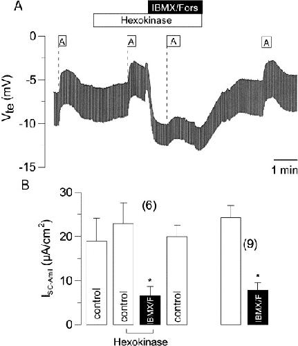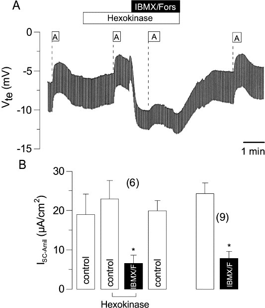Fig. 5. (A) Continuous recording of the transepithelial voltage (Vte) in mouse colon and effects of amiloride on Vte in the presence or absence of IBMX/forskolin and hexokinase/glucose. (B) Summary of the amiloride-sensitive short circuit currents (Isc-Amil) obtained before and after stimulation of CFTR. Isc-Amil is inhibited by CFTR, even in the presence of hexokinase/glucose. Inhibition in the presence of hexokinase/glucose is not different to inhibition of Isc-Amil in the absence of hexokinase/glucose. * indicate significant difference from control (paired t-test). (Number of experiments).