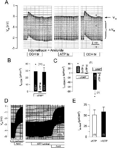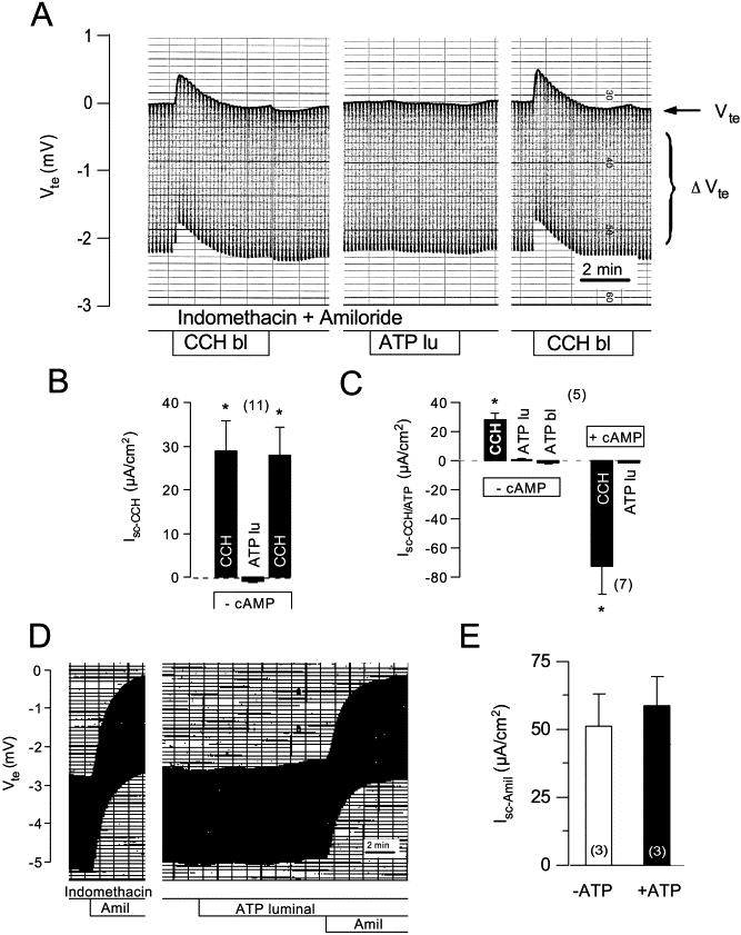 Fig. 6. Transepithelial voltages measured in human colonic biopsies. (A) Continuous recording of the transepithelial voltage (Vte) in human colonic epithelia and effects of stimulation by basolateral carbachol (CCH; 100 μmol/l) and luminal UTP (100 μmol/l). Experiments were performed in the continuous presence of indomethacin and amiloride (both 10 μmol/l). ΔVte=voltage deflection induced by pulsed current injection. (B) Summary of short circuit currents induced by basolateral CCH and luminal ATP in the absence of stimulation by IBMX/forskolin (−cAMP). (C) Summary of short circuit currents induced by basolateral CCH and basolateral or luminal ATP in the absence (−cAMP) or after stimulation by IBMX/forskolin (+cAMP). No effect of ATP on short circuit currents could be detected. (D,E) Missing effect of stimulation by luminal ATP on Isc-Amil. * indicate significant difference from control (paired t-test). (Number of experiments).