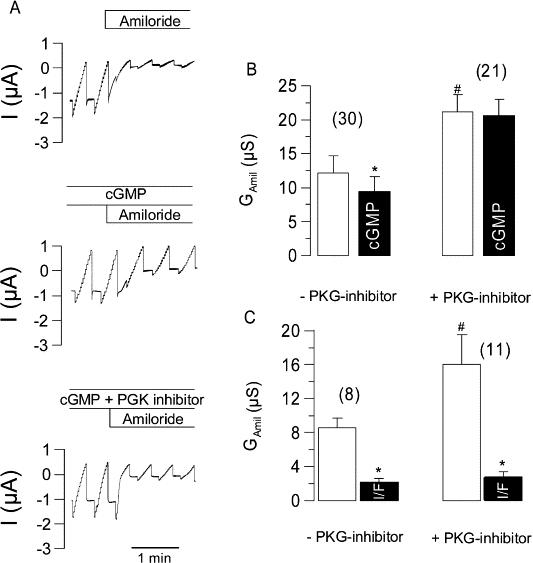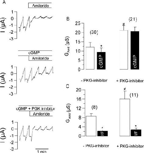 Fig. 7. Effects of cGMP on ENaC expressed in Xenopus oocytes. (A) Continuous recording of the whole cell currents measured in Xenopus oocytes expressing the epithelial Na+ channel ENaC, and effects of amiloride (10 μmol/l) (upper trace). Incubation with 1 mmol/l of membrane-permeable cGMP inhibits ENaC (middle trace). The inhibitory effect of cGMP on ENaC is suppressed by an inhibitor of protein kinase G (lower trace). (B) Summary of the effects of membrane permeable cGMP on amiloride-sensitive whole cell conductance (GAmil) in the absence or presence of the PKG inhibitor. Note that cGMP has a slight but significant inhibitory effect on GAmil only in the absence of PKG inhibitor. The PKG inhibitor enhanced GAmil. (C) Downregulation of GAmil by activation of CFTR with IBMX (1 mmol/l) and forskolin (2 μmol/l) (I/F) takes place in the absence or presence of the PKG inhibitor. # indicate significantly enhanced GAmil in the presence of PKG inhibitor (unpaired t-test). * indicate significant difference from control (paired t-test). (Number of experiments).