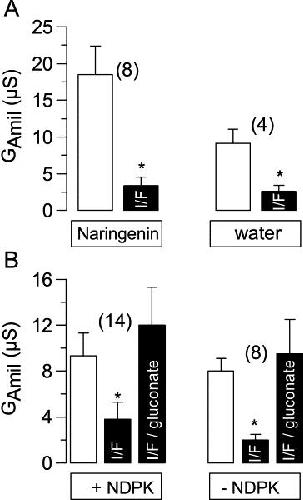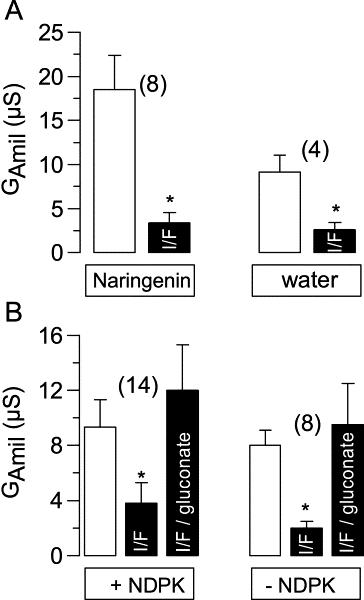 Fig. 9. Summary of amiloride-sensitive whole cell conductances (GAmil) measured in Xenopus oocytes coexpressing ENaC and CFTR. (A) Oocytes were injected with the inhibitor of nucleoside diphosphate kinase, naringenin (final oocyte concentration 50 μmol/l), or water. Downregulation of GAmil by activation of CFTR with IBMX (1 mmol/l) and forskolin (2 μmol/l) (I/F) was not suppressed by naringenin. (B) Additional coexpression of NDPK did not affect downregulation of GAmil by activation of CFTR with IBMX and forskolin. Inhibition of GAmil was reversible upon replacement of extracellular Cl− by gluconate. * indicate significant difference from control (paired t-test). (Number of experiments).
