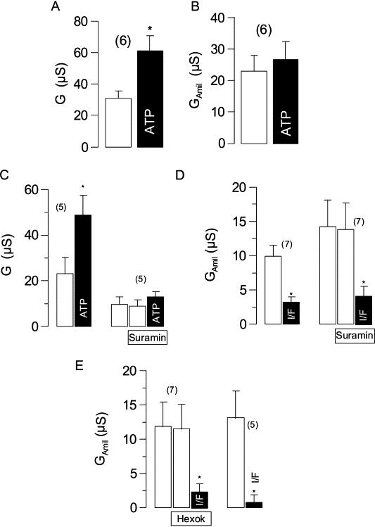 Fig. 4. Summary of whole cell conductances measured in Xenopus oocytes coexpressing ENaC and P2Y2 receptors. A whole cell Cl− conductance is activated by stimulation with ATP (100 μmol/l) (A), which does not affect amiloride-sensitive Na+ conductance (GAmil) (B). (C–E) Summary of whole cell conductances measured in oocytes coexpressing ENaC, P2Y2 receptors and CFTR. A whole cell Cl− conductance is activated by stimulation with ATP (100 μmol/l). Suramin itself has no effects on basal ion conductance (C) or amiloride sensitive conductance (D). However, the effect of ATP is completely suppressed by suramin. Activation of CFTR by IBMX (1 mmol/l) and forskolin (2 μmol/l) (I/F) inhibits GAmil in the absence or presence of suramin (D) or hexokinase (5 U/ml) and glucose (15 mmol/l) (E). * indicate significant difference from control. (Number of experiments).