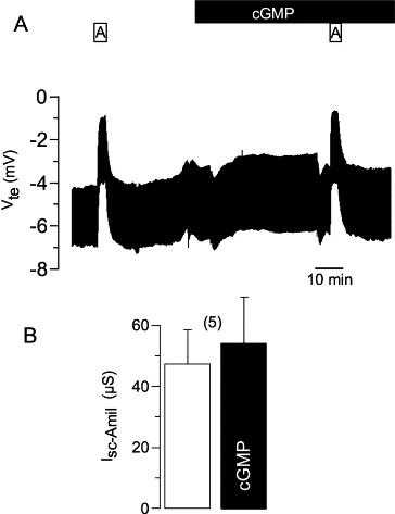 Fig. 8. (A) Continuous recording of the transepithelial voltage (Vte) in mouse trachea and effects of amiloride on Vte in the presence or absence of membrane permeable cGMP. (B) Summary of the amiloride-sensitive short circuit currents (Isc-Amil) obtained before and application of membrane permeable cGMP. (Number of experiments).