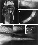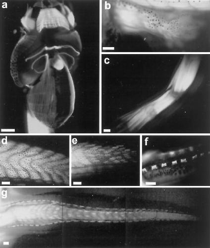 Fig 1. The expression profile of tadpoles transgenic for pCar/GFP. (a) Ventral view of the head region of a 1-wk-old tadpole expressing GFP in cardiac and skeletal muscle. (b) GFP expression in the muscle of the developing limb at NF stage 54. (c) GFP expression in the limbmuscle of a juvenile frog. (d) GFP expression in muscle fibers in the middle of the tail region of a stage 57 tadpole. (e) GFP expression in the mid-tail region of a stage 63 tadpole, demonstrating the loss of GFP fibers in the fast muscle chevrons. (f) GFP expression in the slow muscle cords of the tail in a stage 64 tadpole. (g) Loss of GFP-labeled muscle fibers in the tail of a stage 63 tadpole. [Bars = 500 μm (a, b, and f) and 1 mm (câe and g).]