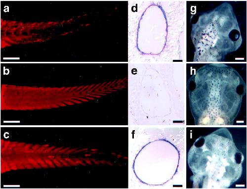 Fig 2. Assaying muscle loss by using a muscle-specific antibody (MF20) after the 2-wk assay of tadpoles with TH. (a) Tail of an animal treated with 10 nM T3 for 7 days. Note the loss of muscle fibers and disorganization of the chevron structures. (b) Tail of an untreated animal. (c) Tail of a pCar/TRDNα transgenic animal treated with 10 nM T3 for 7 days. (dâf) In situ hybridization of tail cross sections obtained from animals in aâc, respectively, with collagenase-3 antisense probe. (gâi) Changes in the head of the animals in aâc, respectively, after the 2-wk assay. [Bars = 500 μm (aâc and gâi), 100 μm (d and e), and 50 μm (f).]