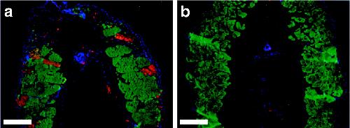 Fig 4. Inhibition of activation of caspase-3 in tailmuscle during spontaneous metamorphosis. (a) Cross section through the mid tail region of a wild-type tadpole at NF stage 62 stained with active caspase-3 antibody (red) and MF20 (green) and counterstained with 4â²,6-diamidino-2-phenylindole (DAPI; blue). (b) Similarly stained cross section through the mid-tail region of a pCar/TRDNα tadpole. (Bars = 100 μm.)