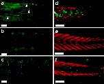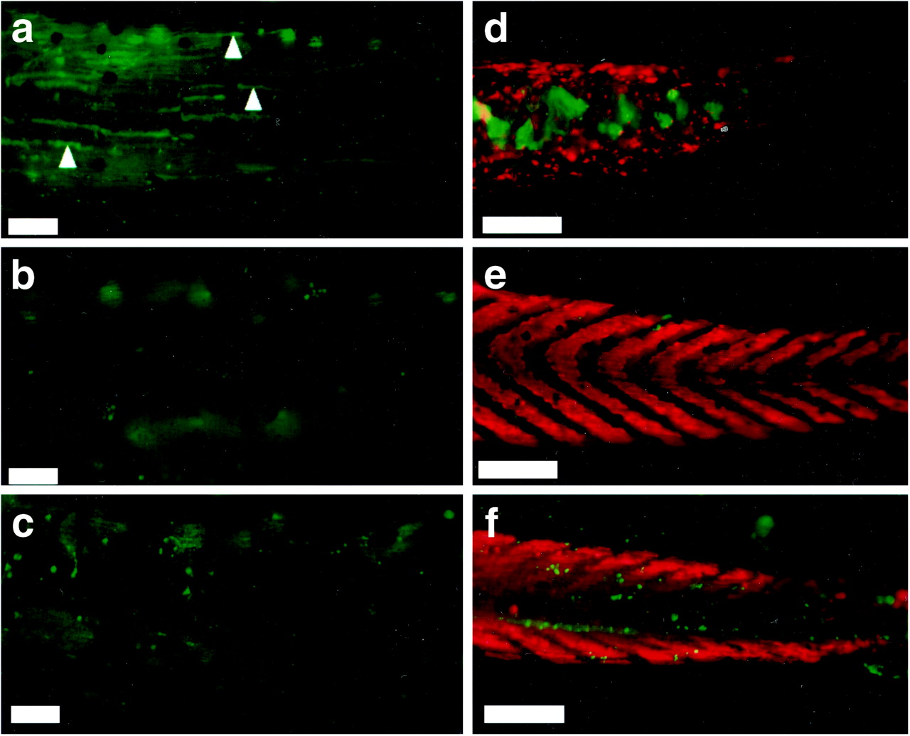 Fig 3. Caspase-3 activity in the tadpole tails in the 2-wk assay and retention of muscle in tail tip. (a) Tail from a wild-type animal treated with 10 nM T3 for 4 days. Note the caspase-3-positive muscle fibers (examples are shown with arrowheads). (b) Tail from an untreated control animal. (c) Tail from a pCar/TRDNα-expressing animal treated with 10 nM T3 for 4 days. Note the caspase-3-positive epidermal cells similar to a but the lack of caspase-positive muscle fibers. (dâf) Tips of the tail stained with MF20 (red) and anti-active caspase-3 antibody (green) of 10 nM T3-treated (7 days) wild-type, untreated wild-type, and 10 nM T3-treated (7 days) pCar/TRDNα tadpoles, respectively. [Bars = 100 μm (aâc) and 200 μm (dâf).]