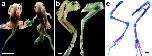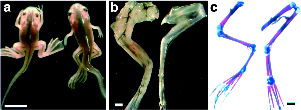 Fig 5. Inhibition of muscle formation in the limbs in the pCar/TRDNα animal. (a) Wild-type and pCar/TRDNα tadpoles at stage 63. The transgenic animal will die at this stage. (b) The skinned hind limbs of the animals shown in a, demonstrating the reduced muscle formation in the transgenic tadpole. (c) Bone (red) and cartilage (blue) staining of the same hind limbs. [Bars = 1 cm (a) and 500 μm (b and c).]