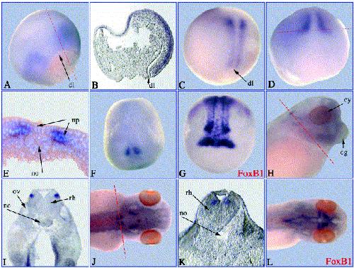 Fig. 3. Spatial expression of xFoxB2. Whole mount in situ hybridisation was performed with xFoxB2 and xFoxB1 (G, L) antisense probes and embryos at different developmental stages. (A) Stage 11; (B) parasagittal section of A; (C) stage 12; (D) stage 14; (E) transversal section of D, nuclei stained with DAPI; (F) stage 15; (G) FoxB1 (Fkh-5), stage 16; (H) stage 35; (I) horizontal section of H; (J) stage 41; (K) horizontal section of J; (L) FoxB1, stage 41. Embryos shown in (AâC) are orientated with dorsal side to the right and animal half to the top; D, F, G anterior view; H shows a lateral and J as well as L a dorsal view. The plane of sections is marked by red lines. cg, cement gland; dl, dorsal lip; ey, eye; np, neural plate; no, notochord; ov, otic vesicle; rh, rhombencephalon.