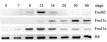 Fig. 2. Temporal expression of xFoxB2 and xFoxI1c during embryogenesis. RT-PCR was performed with RNA of different developmental stages using primers for FoxB2, FoxI1c and FoxI1a. Histone H4 was used as an internal control, staging was done according to Nieuwkoop and Faber (1967).