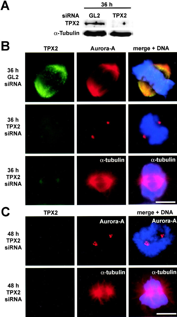 Figure 5. TPX2 localizes Aurora-A to the spindle. (A) Western blot analysis of total extracts form HeLa cells treated for 36 h with a TPX2-specific siRNA duplex or a control duplex (GL2). Filters were probed for Aurora-A and α-tubulin as a loading control. (B and C) HeLa S3 cells were treated for 36 (A) or 48 h (B) with TPX2-specific siRNA duplex or a control duplex (GL2) and then fixed and stained with the antibodies indicated. Right panels show merged images, including DNA staining by DAPI. Bars, 10 μm.