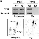 Figure 2. TPX2 physically interacts with Aurora-A and is phosphorylated on serine. (A, top) Immobilized recombinant Aurora-A WT and KD proteins were incubated for 1 h at 4°C in mitotic HeLa cell extract, washed in LS buffer, and analyzed by SDS-PAGE followed by Coomassie blue staining (lanes 1 and 2). Controls show the results of incubating extract with beads alone (lane 3) and of loading WT Aurora-A protein without extract incubation (lane 4). Arrowheads indicate the prominent 100-kD protein that was identified as TPX2 by Western blotting. (A, bottom) Western blots were performed on the same samples using antibodies against TPX2 and Aurora-A. (B) In vitro binding of recombinant TPX2 (IN) to immobilized GST-tagged Aurora-A WT and KD proteins, or GST for control. (C) Mapping the interaction domains on Aurora-A and TPX2. Fragments of Aurora-A and TPX2, as indicated schematically, were produced by IVT, and binding to His6-TPX2 (top) or GST-Aurora-A (bottom) was assayed. Protein complexes were recovered on Ni-Sepharose beads and glutathione beads, respectively; Ni-Sepharose beads or GST-coated glutathione beads were used for control. Autoradiographs show corresponding amounts of input samples and proteins recovered in protein complexes. (D) In vitro kinase assay was performed with recombinant GST-tagged Aurora-A and recombinant human TPX2 in the presence of [γ-32P]ATP. Both the Coomassie blue–stained gel (left) and the autoradiograph (right) are shown. (D, bottom) Phosphoamino acid analysis of 32P-labeled TPX2 (right); ninhydrin staining (left) shows the migration of phosphoamino acid standards.