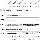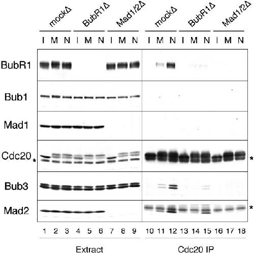 Figure 2. Mutual dependency between BubR1 and Mad2 in binding to Cdc20. CSF-arrested extracts were depleted with control IgG (mockΔ; lanes 1–3 and 10–12), anti-BubR1 (BubR1Δ; lanes 4–6 and 13–15), or anti-Mad2 (Mad1/2Δ; lanes 7–9 and 16–18) antibody. The extracts were induced to enter interphase (lanes 1, 4, 7, 10, 13, and 16), were kept at metaphase (lanes 2, 5, 8, 11, 14, and 17), or were incubated with nuclei and nocodazole to activate the spindle checkpoint (lanes 3, 6, 9, 12, 15, and 18). Anti-Cdc20 immunoprecipitates were prepared from these extracts. The extracts (lanes 1–9) or immunoprecipitates (lanes 10–18) were immunoblotted for the proteins indicated on the left. The asterisks indicate a cross-reacting protein and IgG heavy chain on the left and right panels of Cdc20 blots, respectively. The asterisk on the right of Mad2 blot indicates IgG light chain that migrates right above Mad2. Immunodepletion with anti-Mad2 antibody removes both Mad1 and Mad2. |