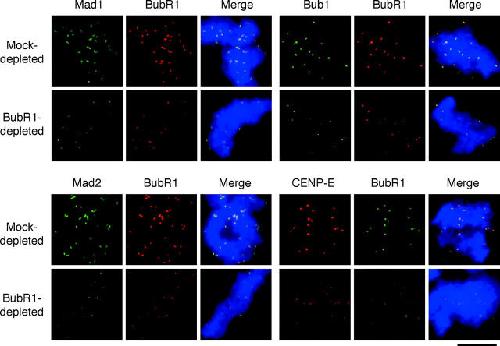 Figure 3. BubR1 is required for kinetochore binding of Mad1, Mad2, Bub1, and CENP-E. Mitotic chromosomes were isolated from mock- or BubR1- depleted extracts treated with nocodazole and then incubated with rabbit antibodies against Mad1, Mad2, or Bub1, as indicated on top, followed by fluorescein-conjugated anti–rabbit antibody. BubR1 was then detected with biotinylated anti-BubR1 antibody and Texas red– conjugated streptavidin. For double staining of CENP-E and BubR1, rabbit antibody against BubR1 was used, followed by fluorescein-conjugated anti–rabbit antibody. CENP-E was then detected with biotinylated anti–CENP-E antibody and Texas red–conjugated streptavidin. Chromosomes were stained with Hoechst 33258. The merge pictures contain all three fluorochromes. All images of the same fluorochrome were taken for the same exposure time and processed in the same way. Bar, 10 μm. |