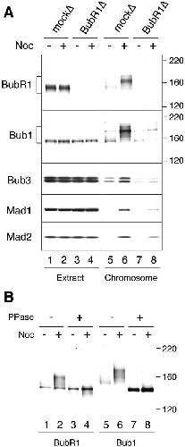 Figure 4. BubR1 is required for other spindle checkpoint proteins to associate with chromosomes. (A) Immunoblot analysis of various checkpoint proteins associated with chromosomes. Mitotic chromosomes were isolated from mock-depleted (lanes 1, 2, 5, and 6) or BubR1-depleted (lanes 3, 4, 7, and 8) extracts that were untreated (lanes 1, 3, 5, and 7) or treated with nocodazole (lanes 2, 4, 6, and 8). The extracts or chromosomal fractions were immunoblotted for proteins indicated on the left. The migration of molecular size standards is indicated on the right for BubR1 and Bub1 blots. (B) Phosphatase treatment removes mobility shift of chromosomal BubR1 and Bub1. Chromosomal pellets prepared from untreated extracts (lanes 1, 3, 5, and 7) or extracts treated with nocodazole (lanes 2, 4, 6, and 8) were treated with phosphatase buffer (lanes 1, 2, 5, and 6) or LPP (lanes 3, 4, 7, and 8). The samples were then immunoblotted for BubR1 (lanes 1–4) or Bub1 (lanes 5–8). The migration of molecular size standards is indicated on the right. |