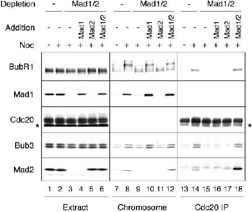 Figure 7. Hyperphosphorylation of chromosomal BubR1 requires Mad1. Mock-depleted extracts or extracts lacking Mad1 and/or Mad2 were prepared as described for Fig. 6 B (lanes 1–6). The extracts were incubated with nuclei (15,000 nuclei/μl extract) in the absence or presence of nocodazole as indicated on top. The samples were then subjected to chromosome isolation or immunoprecipitation with anti-Cdc20 antibody. The extracts (lanes 1–6), chromosomal fractions (lanes 7–12), and Cdc20 immunoprecipitates (lanes 13–18) were immunoblotted for proteins indicated on the left. The band above Mad2 in lanes 13–18 is the IgG light chain. The blots for Mad1 in Cdc20 immunoprecipitates and for Cdc20 in the chromosomal fractions are not shown, because of a lack of specific association. Exogenously added Mad1 and Mad2 tend to nonspecifically associate with Cdc20 immunoprecipitates, resulting in the high level of Mad2 in lane 18. |