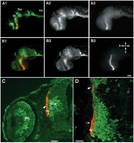 mid-optic tract, tectum as well as in the hindbrain. (A3–B3): HRP-labeled optic projection. (C–D).