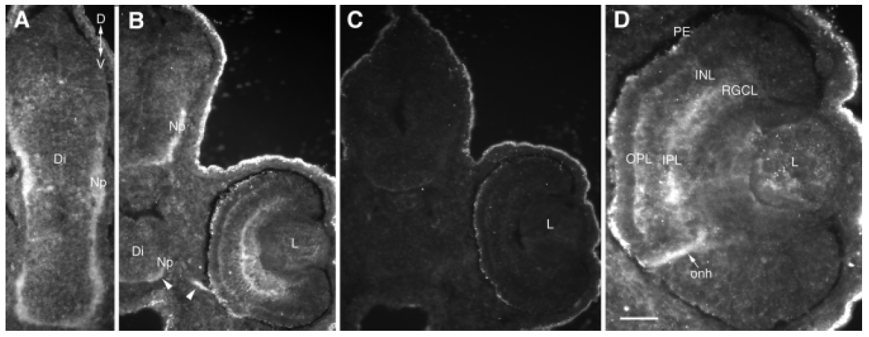 immunopositive (arrow). Di, diencephalon; PE, pigment epithelium; L, lens; Np, neuropil; D,