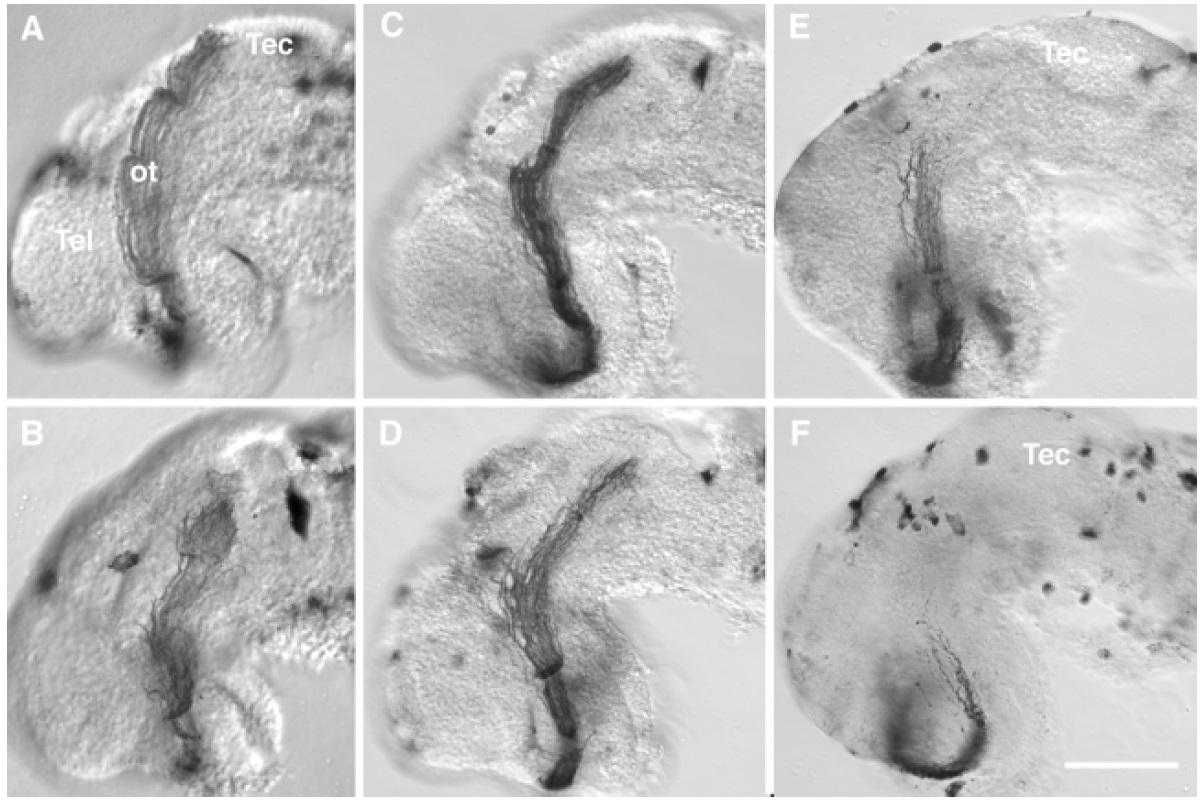 optic projection in wholemount stage 40 brains (A–B) exposed to either control solution (A) or 500