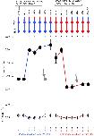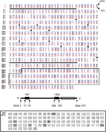 Figure 5. . Comparison of rP2X2 and mP2X2 sequences. The top panel shows an alignment for the entire rP2X2 and mP2X2 protein sequences (black lines are above predicted transmembrane domains and the black dots indicate the conserved cysteine residues), whereas the middle panel shows a representation of P2X subunit topology. The bottom panel shows an alignment of the mP2X2 cDNA used in this study, and the corresponding sequence of the mP2X2 gene. The codons for the amino acids that differ between mP2X2 and rP2X2 are shown in gray. Note that the genomic sequence agrees with the cDNA sequence in each case, assuring that the mP2X2 cDNA contains no PCR errors. The boxed regions correspond to identical sequence. |