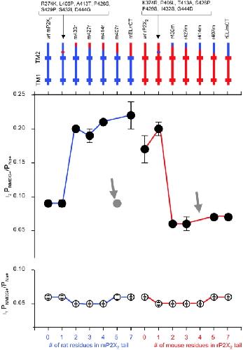 Figure 7. . Identification of C tail domain residues that govern permeability changes in the P2X2 channel. The top panel illustrates the location of P2X2 channel mutants, and chimeras with respect to the two TM domains. The bottom panel shows PNMDG+/PNa+ for the I2 and I1 states. Note that I1 PNMDG+/PNa+ is constant for all channels, but I2 PNMDG+/PNa+ varies depending on the composition of the C tail domain. Thus rP2X2 channels undergo large changes between I1 and I2, whereas mP2X2 channels do not. The differences can be reversed by transplanting the C tail domains (mEL/rCT and rEL/mCT) and by making chimeras that include the two most COOH-terminal rP2X2 residues of the seven that differ in this domain (see Fig. 5). The gray arrows point to uninformative or outlier constructs. |