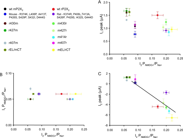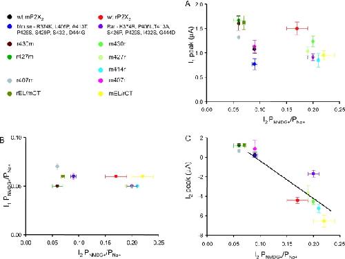 Figure 8. . Relationship of permeability changes to steady-state currents, I1 and I2. (A) The relationship between I1 amplitude and I2 PNMDG+/PNa+. (B) The relationship between I1 PNMDG+/PNa+ and I2 PNMDG+/PNa+. (C) The relationship between I2 amplitude and I2 PNMDG+/PNa+; the two parameters are well correlated (r = 0.9). We verified that slope conductance values followed a similar trend to current peak amplitudes for the majority of mutants where such data was available. For this figure, the single point mutants shown in Fig. 6 have been pooled, and there is no point for the r414m chimers because there was no measurable I2. |
