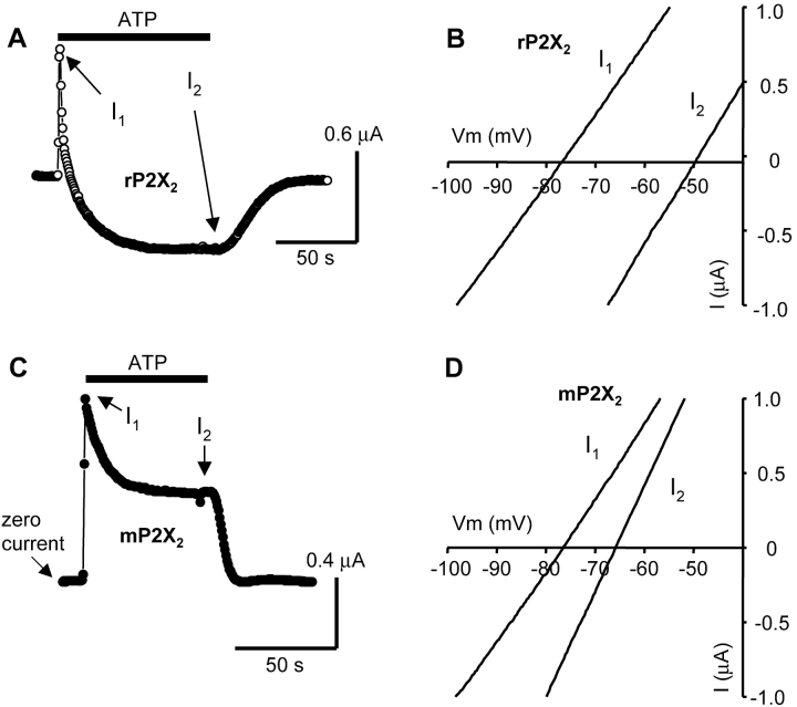 Figure 3. . rP2X2 and mP2X2 channels differ with respect to permeability changes. (A) rP2X2: steady-state current waveform (−60 mV) in NMDG+ extracellular solutions. ATP was applied when indicated and evoked an outward current that became inward over time. (B) Reversal potentials at the peak of I1 and I2 for rP2X2. (C) mP2X2: steady-state current waveform in NMDG+ extracellular solutions. ATP was applied for the period indicated and evoked an outward current that waned to a steady-state level. (D) Reversal potentials at the peak of I1 and I2 for mP2X2. |