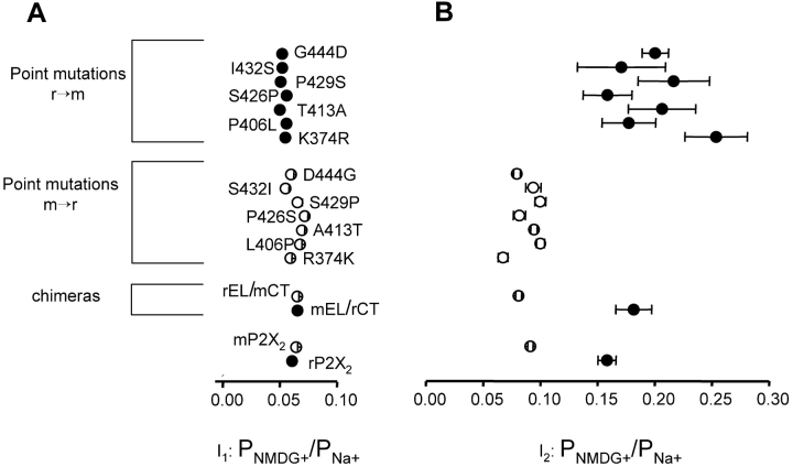 Figure 6. . No single amino acid residue in the COOH-terminal domain accounts for the differences between mP2X2 and rP2X2 channels. The scatter graphs show data for wt mP2X2, rP2X2, mEL/rCT, rEL/mCT, and 14 single point mutant channels: (A) I1 PNMDG+/PNa+ and (B) I2 PNMDG+/PNa+. ATP-evoked currents for all mutants, chimeric, and wild-type channels were similar in amplitude for recordings in Na+ solutions, indicating approximately equivalent membrane expression. |